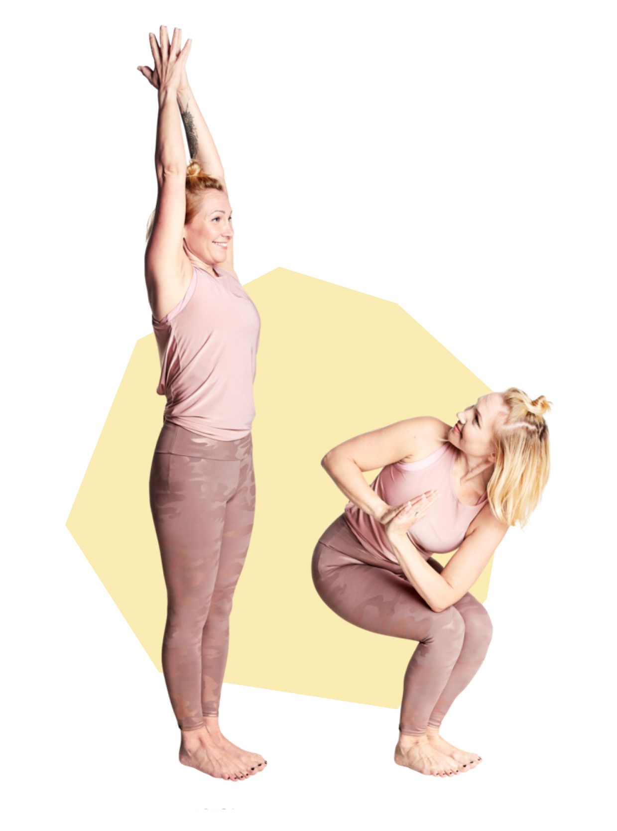 Sisäänhengityksellä venytä itsesi pitkäksi painamalla jalkapohjia alustaan ja työntämällä päälakea ja käsiä kohti kattoa (A). Uloshengityksellä vedä vatsaa kevyesti sisään ja lantionpohjaa suppuun ja kyykisty kuin istuisit tuolille. Tuo kädet rintakehän eteen ja kierrä vasen kyynärpää oikeaan polveen. Pidä niska pitkänä ja anna pään kiertyä oikealle (B). Sisäänhengityksellä venytä itsesi uudelleen pitkäksi ja uloshengityksellä kyykisty ja kierrä toiselle puolelle.