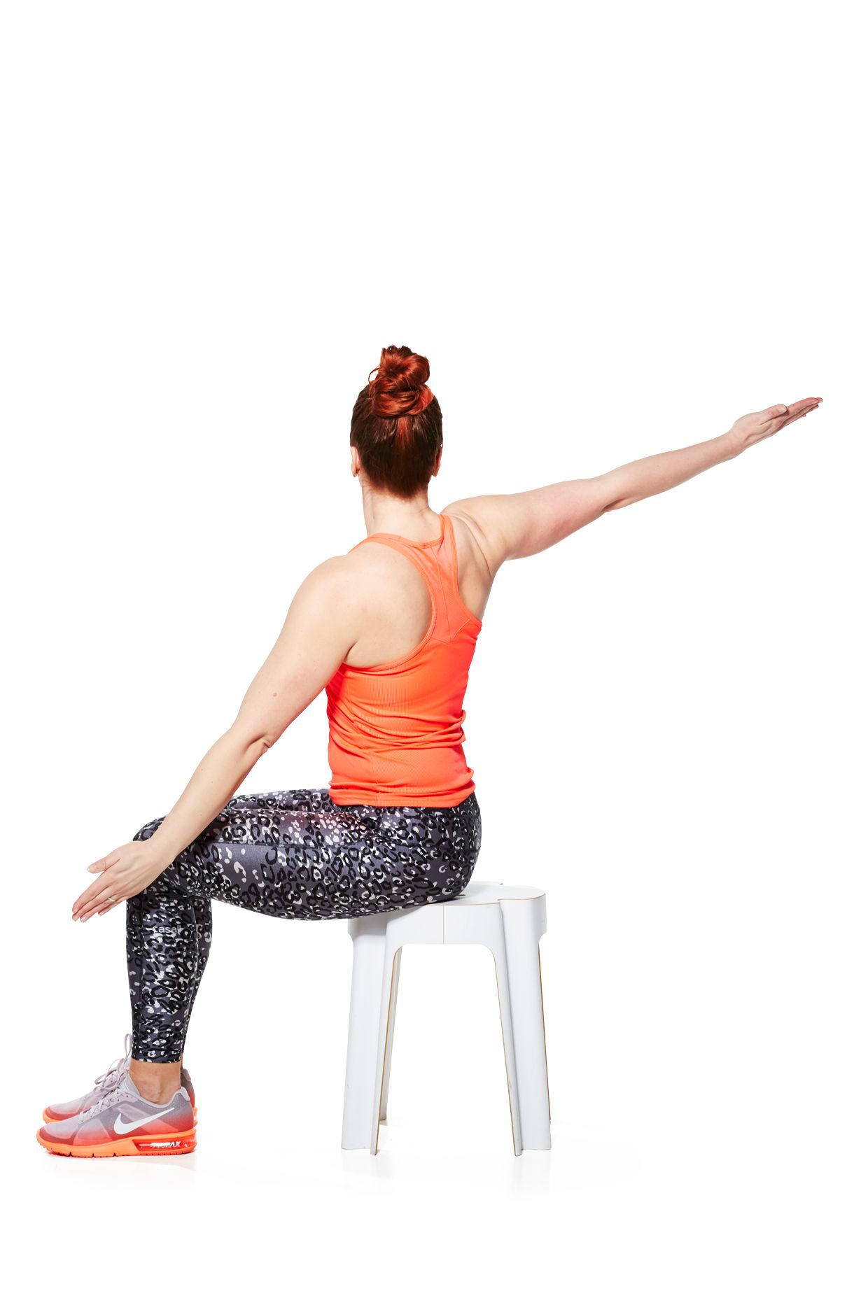Tee näin: Istu hyvässä ryhdissä, kumarru ja kierrä rankaa sekä kurkota kädellä ristikkäisen polven yli. Anna leuan painua rintaan. Ojenna takaisin ja avaa rintaa takaviistoon.