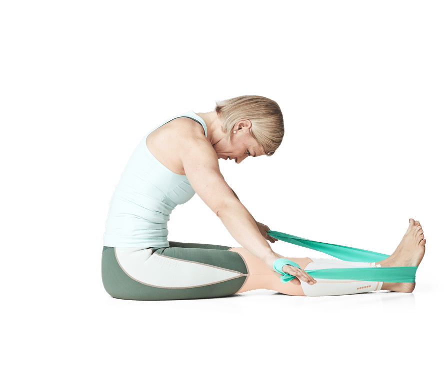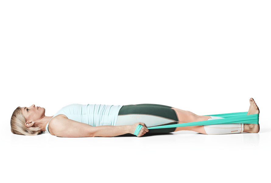 Asetu selinmakuulle kuminauha jalkapohjien alla. Tiivistä lantionpohjaa ja alavatsaa, pyöristä alaselkää ja venytä se pitkäksi.