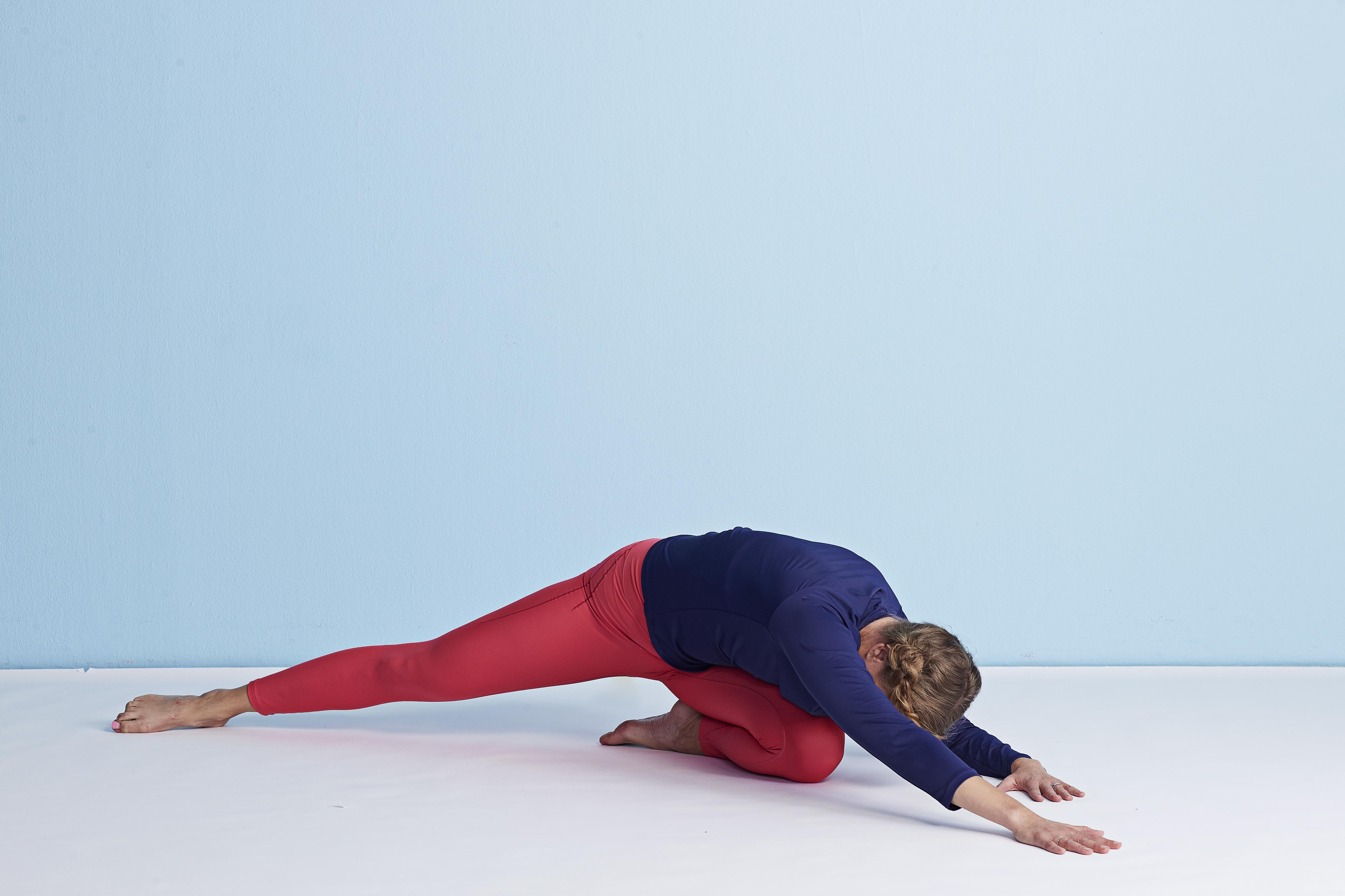 Sisäänhengityksellä laskeudu lattialle ja liu’uta oikeaa jalkaa pitkälle takaviistoon ja oikeaa kättä etuviistoon. Kylki venyy varpaista sormenpäihin saakka. Jatka sisäänhengitystä ja tunne, kuinka ilma virtaa selän ja kyljen puolelle.
