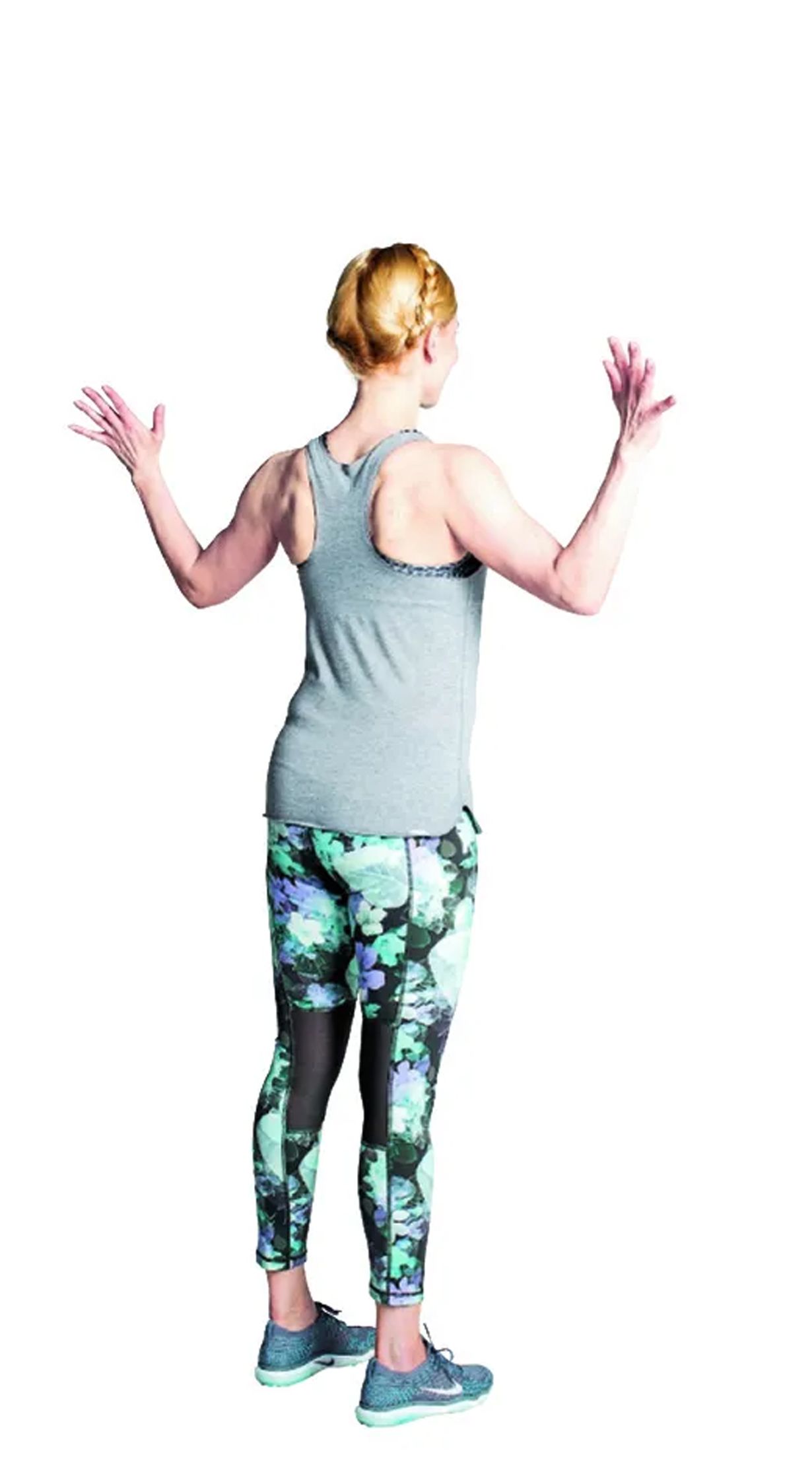 Tuo kädet antaudun-asentoon ja harita sormia voimakkaasti. Käännä kämmeniä kohti kattoa ja vie hartioita taakse. Kippaa kädet alakautta takaviistoon, suorista kyynärvarret ja käännä sormia kohti rannetta. Pidä hetki. Palaa samaa reittiä alkuasentoon. Alla olevat kuvat näyttävät, miten liike tehdään.