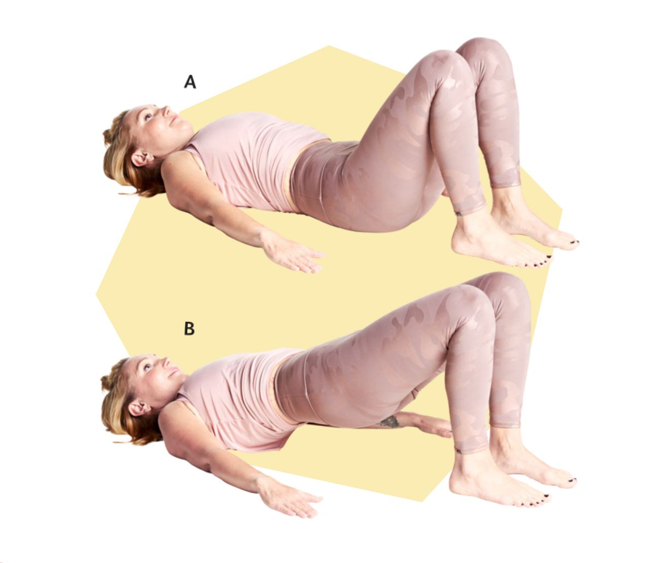 KÄY SELINMAKUULLE polvet koukussa ja jalkapohjat maassa. Aseta jalkaterät noin lantion leveydelle. Tunnista hyvä lantion asento: alaselkä ei ole notkolla eikä painunut alustaa vasten, vaan neutraalissa asennossa (A). Uloshengityksellä paina jalkapohjia tiiviisti alustaan, jännitä pakaroita, tiivistä vatsaa ja nosta lantio ilmaan. Alaselkä pysyy myös noston ajan neutraaliasennossa (B). Hengitä yläasennossa sisään. Uloshengityksellä laske lantio nikama nikamalta rullaten takaisin alustalle. Jatka 2 minuuttia rauhallisen hengityksen tahdissa.
