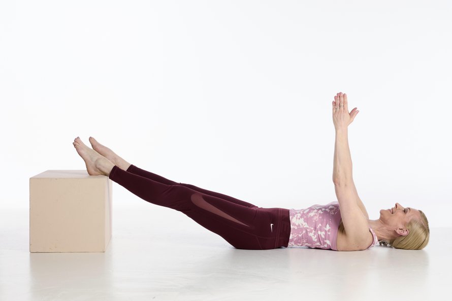 Yläselkä pysyy lattiassa. Nosta kädet ylös. Pidä 45–60 sekuntia. Vartalo pysyy suorana. Jos haluat lisää haastetta, voit nostaa toisen jalan kohti kattoa. Voimakasta takaketjua eli pakaralihaksia, takareiden lihaksia ja pohkeita tarvitaan ylläpitämään hyvää ryhtiä.