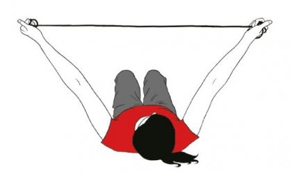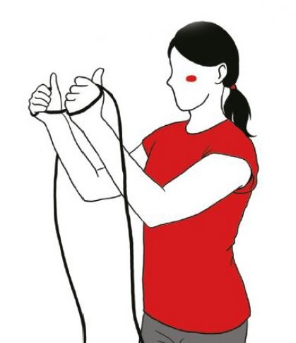 Venytä kuminauhaa kevyesti käsien välissä ja nosta nyrkit etukautta silmien korkeudelle. Laske kädet alas nyrkissä ja kuminauhaa koko ajan lisää venyttäen. Älä kohota hartioita.