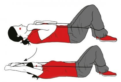 Venytä kuminauhaa käsien välissä ja kierrä samalla peukaloita ulospäin. Pidä lapaluut koko ajan alustaa vasten.
