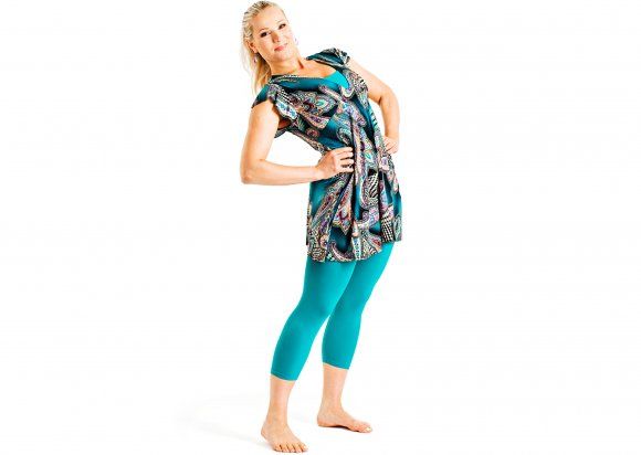 ➠ Aseta kädet lanteille. Taivuta kehoa kellotaulun mukaisesti: Työnnä lantio ja napa reilusti eteen (klo 12). Työnnä sitten lantio oikealle (klo 3), jolloin ylävartalo kallistuu vasemmalle. Työnnä takapuoli ja napa taakse (klo 6). Työnnä lantio vasemmalle (klo 9), jolloin ylävartalo kallistuu oikealle. Käy kaikki suunnat läpi kolme kertaa molempiin suuntiin. Seuraavaksi pyöritä koko kellotaulu ympäri 10 kertaa molempiin suuntiin.