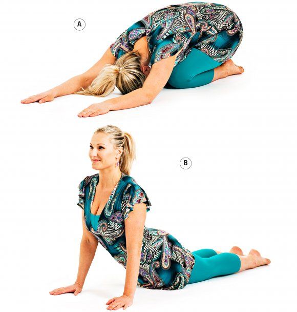 ➠ Laske takapuoli kantapäiden päälle ja venytä kädet lattialle pitkälle eteen (kuva A). Sisäänhengityksellä nouse konttausasentoon. Uloshengityksellä laskeudu varovaisesti kobra-asentoon (kuva B). Venytä niska pitkäksi. Sisäänhengityksellä palaa konttausasentoon. Uloshengityksellä laskeudu alkuasentoon. Jos alaselässä on yliliikkuvuutta, jätä selkä suorempaan, lankkumaiseen asentoon.