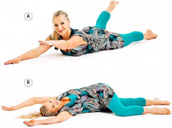 osoittamaan asentoon. Sisäänhengityksellä kierähdä hitaasti jarrutellen takaisin vatsallesi. Pidä ylävartalo, vasen käsi ja oikea jalka edelleen kohotettuina. Uloshengityksellä laske alas. Toista liike