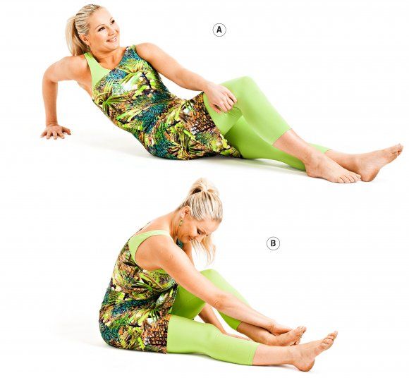 ➠ Nojaa taakse oikean käden varaan (kuva A) ja tartu vasemmalla kädellä oikeaan polveen. Hengitä sisään. Uloshengityksellä koukista vasen polvi ja tartu oikealla kädellä vasemman jalan ulkosyrjästä. Pyöristä selkää ja työnnä jalkaa kevyesti poispäin kehosta (kuva B). Tee 5 toistoa molemmin puolin.