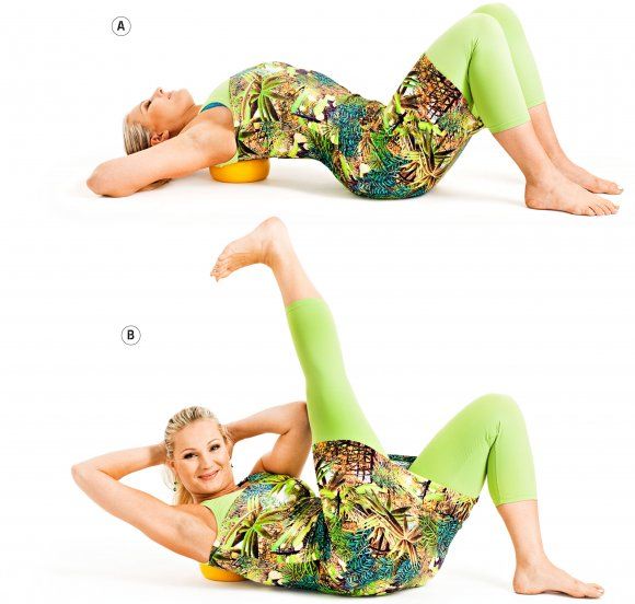 ➠ Asetu koukkuselinmakuulle ja laita pallo lapojen väliin (kuva A). Voit käyttää mitä tahansa läpimitaltaan noin 20-senttistä palloa. Risti sormet pään taakse ja anna kyynärpäiden painua lattiaan. Hengitä sisään. Uloshengityksellä kädet kohottavat pään ylös. Kierrä vasen kyynärpää kohti oikeaa polvea ja ojenna oikea jalka suoraksi kohti kattoa (kuva B). Koukista nilkka. Sisäänhengityksellä palaa alkuasentoon. Uloshengityksellä kierrä oikea kyynärpää kohti vasenta jalkaa. Toista 5 kertaa molemmin puolin.