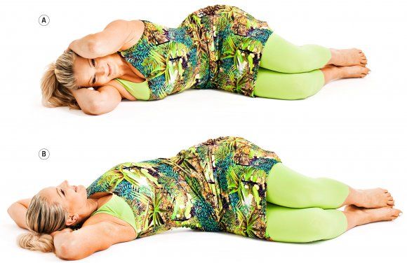 ➠ Asetu kylkimakuulle (kuva A). Lonkat ja polvet ovat koukussa, sormet ristissä pään takana ja kyynärvarret lähellä ohimoita. Sisäänhengityksellä vie vasen kyynärpää selän taakse kohti lattiaa. Rinta ja kasvot kääntyvät kohti taivasta (kuva B). Uloshengityksellä palaa alkuasentoon. Toista 10 kertaa ja vaihda sitten kylkeä.