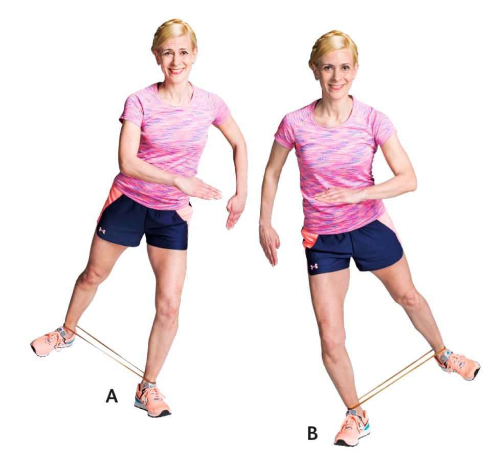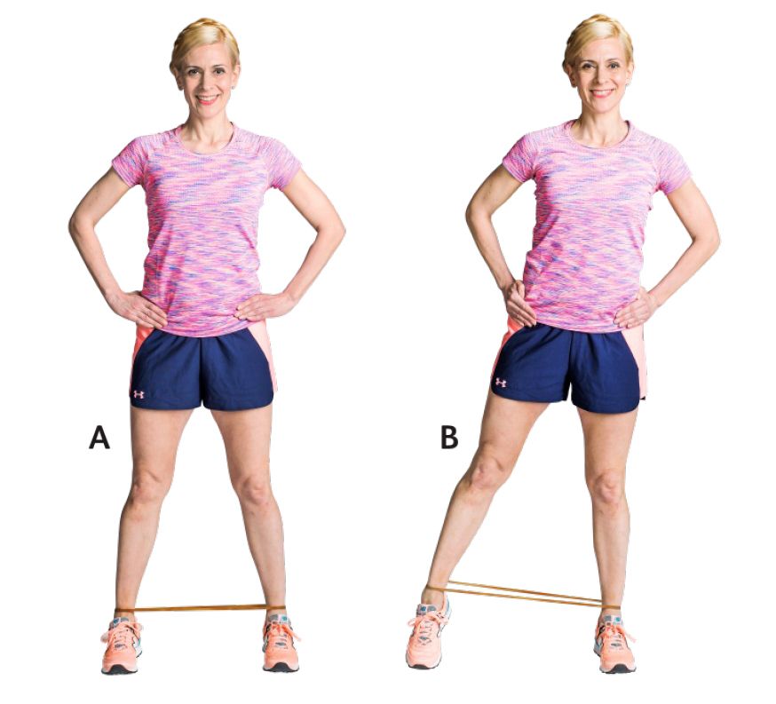 TEE NÄIN: Seiso haara-asennossa kuminauha nilkkojen ympärillä. Vedä vatsa sisään, tiivistä pakaran alaosa ja tuo kädet lantiolle (A). Tee sivulle viereen -askelluksia edes takaisin (B). Askella tikku-ukkotyyliin eli suorin, jäykin jaloin. Jos päästät jalat koukkuun ja takapuolen pitkälle, liike ei enää kohdistu pakaran sivuun.