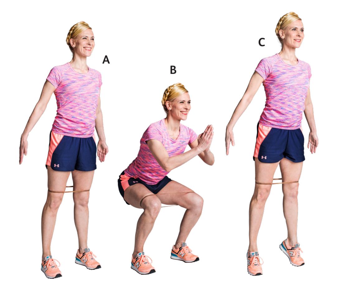 TEE NÄIN: Ota lantionlevyinen haara-asento. Sujauta kuminauha polvien yläpuolelle. Seiso ryhdikkäänä kädet sivuilla, hieman takaviistossa (A). Jännitä peppu piukaksi ja laskeudu kyykkyyn jarruttamalla pakaralla alas mennessä ja tuo kädet eteen (B). Kun lähdet nousemaan takaisin ylös, työnnä jalkapohjia lattiaan ja purista pakaroita. Alkuasennossa päästä pakarat rennoiksi. Voit tehostaa ja nousta päkiöille (C).