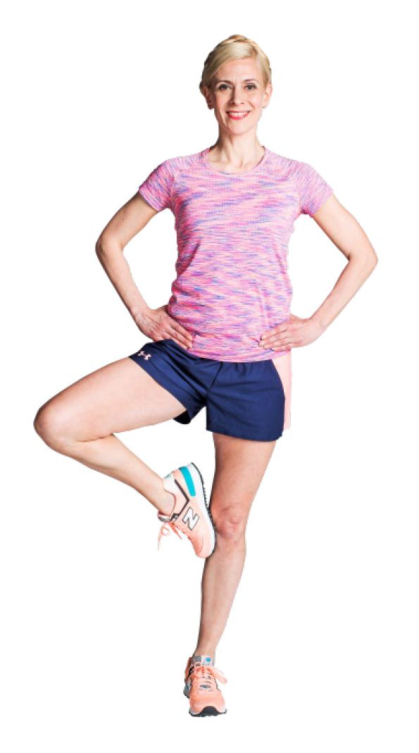 TEE NÄIN: Seiso hyvässä perusasennossa kädet lantiolla, napa sisään vedettynä ja selkä neutraalissa asennossa. Avaa polvi sivulle ja nosta jalkaterä nilkkaan tai polveen. Pysy tässä asennossa. Muista edellisessä liikkeessä löytämäsi pakaran alaosan tuki ja pidä huoli, ettei lantio pääse tipahtamaan sivulle.