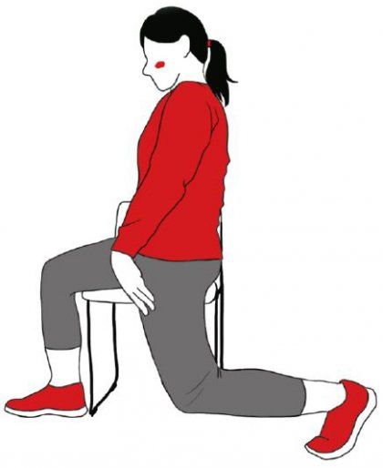 Käy istumaan tuolille sivuttain ”mäkihyppääjän alastuloasentoon” toinen jalka koukussa edessä ja toinen koukussa polvi kohti lattiaa. Pidä selkä suorana ja paina lantiota eteenpäin, kunnes venytys tuntuu reiden etuosassa. Venytä 30–60 sekuntia ja vaihda puolta.