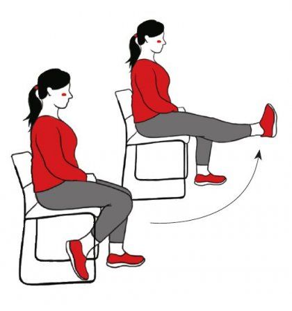 Istu tuolille ja vie jalat koukkuun tuolin alle. Ojenna yksi jalka kerrallaan suoraksi eteesi ja koukista uudelleen tuolin alle. Tee ensin toinen puoli ja sitten toinen.