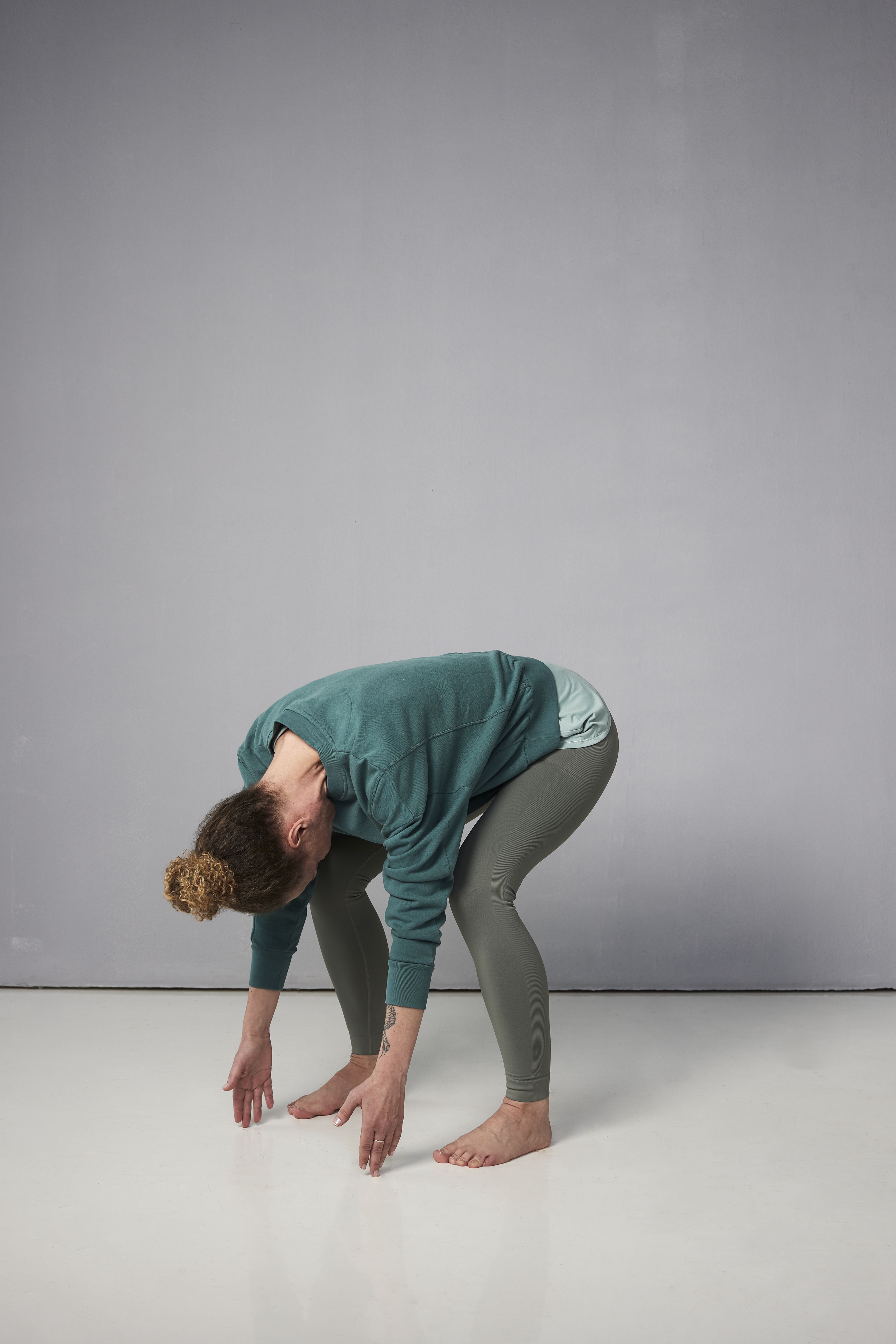 Seiso niin, että jalat ovat hieman hartioita leveämmässä asennossa. Käy kyykyssä polvista joustaen ja kosketa sormilla alustaa. Nouse sitten ylös ja nosta samalla kädet suoriksi pään päälle. Harota sormia ja nouse vielä päkiöille. Toista 5–8 kertaa.