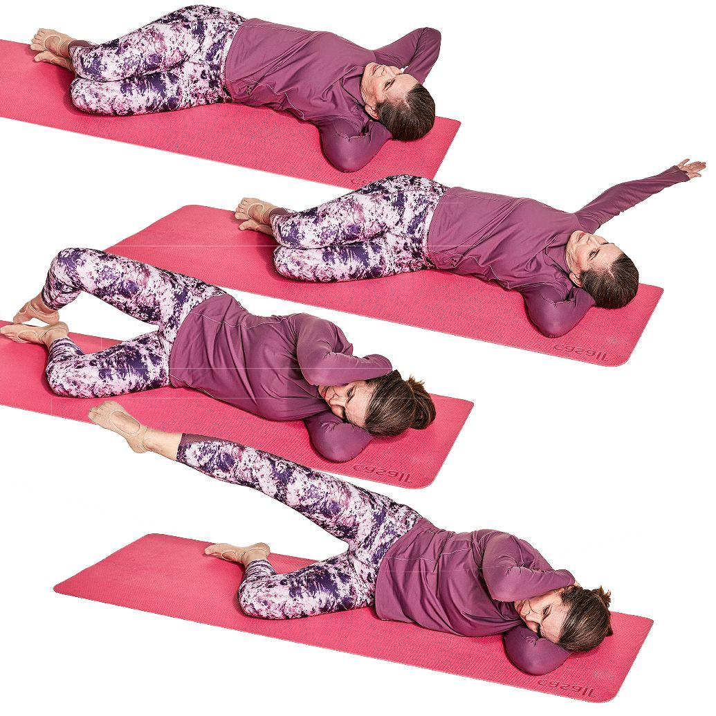 Sisäänhengityksellä kierrä päällimmäisen jalan polvea kohti kattoa, lantio paikallaan. Uloshengityksellä ojenna polvi. Sisäänhengityksellä koukista polvi ja uloshengityksellä palauta alemman jalan päälle, purista jalkoja kevyesti yhteen.