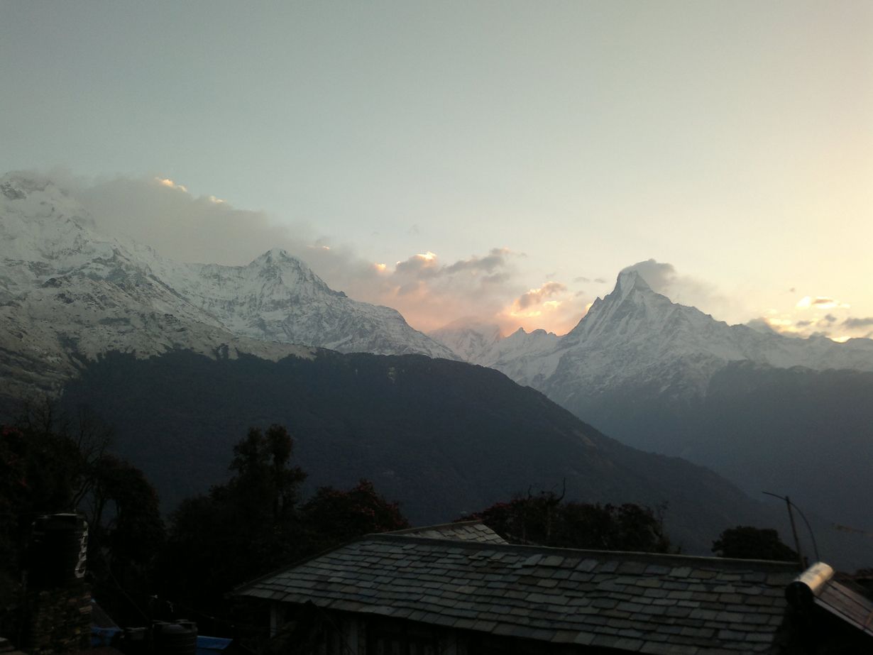 Aamukuudelta vessaan mennessä tajusin, miksi majatalon nimi oli View Point. Olimme nukkunet lumihuippujen sylissä. Toppatakki vain päälle ja pihalle seuraamaan, kuinka aurinko nousi Himalajan takaa ja sai ilman kimmeltämään. Tätä samaa ihmettä seurasin joka aamu ihastuksesta mykkänä peltimuki kuumaa masalateetä kädessä. Siitä ei ollut kiire minnekään.