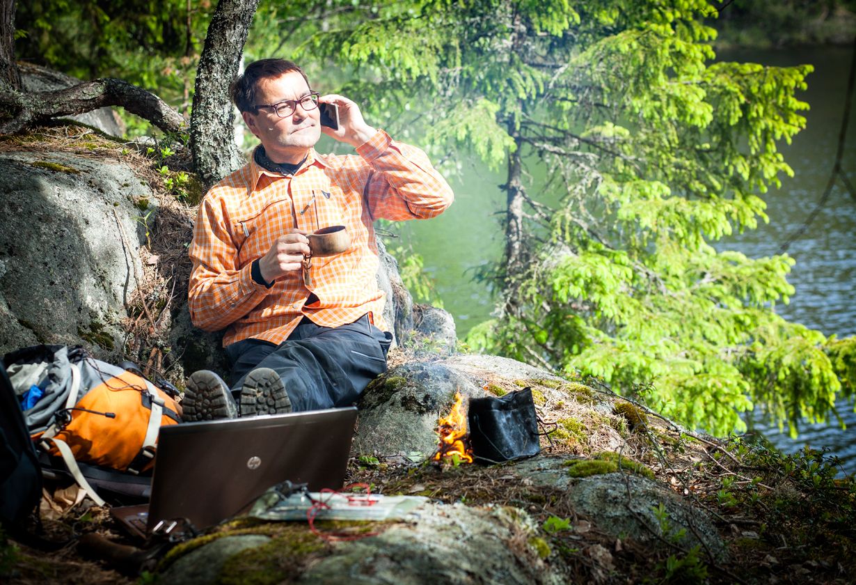 Simo ihmettelee joskus, mikseivät muut tee töitä luonnossa. Kaikki tarvittavat paperit löytyvät skannattuina sähköpostista ja myös muistiinpanoja voi tehdä sähköisesti nuotion äärellä tai tuvalla. Sähköpostit kulkevat normaaliin tapaan. Kännykkää varten tarvitaan vain vara-akku.