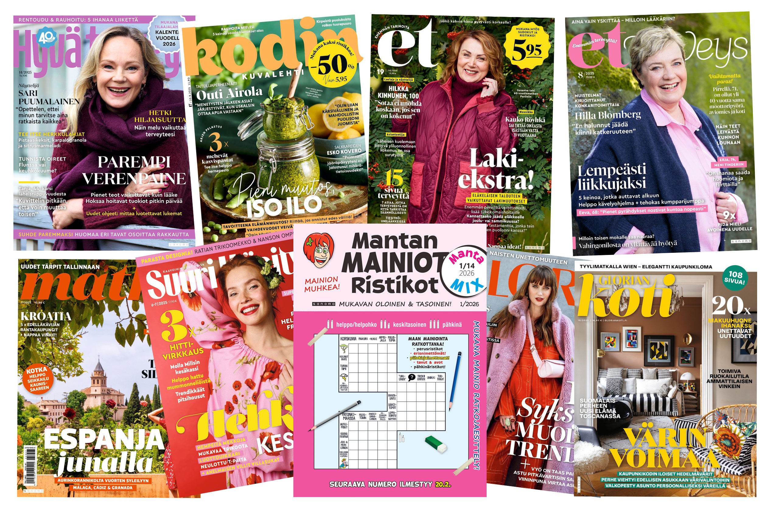 Osallistu arvontaan ja voit voittaa kolmen kuukauden tilausjakson valitsemastasi Sanoman aikakauslehdestä: Gloria, Glorian Koti, ET-lehti, ET Terveys, Hyvä terveys, Kodin kuvalehti, MantaMix, Matka ja Suuri käsityö. Arvomme kaksi lehtitilausta. Yhden palkinnon arvo on 24–75 euroa.