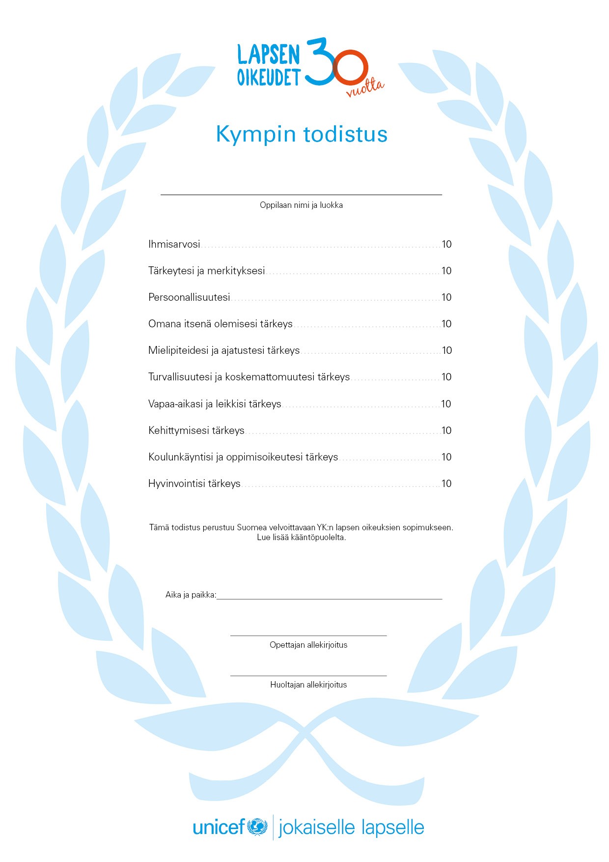 Koulut voivat ladata Kympin todistuksen Unicefin sivuilta.