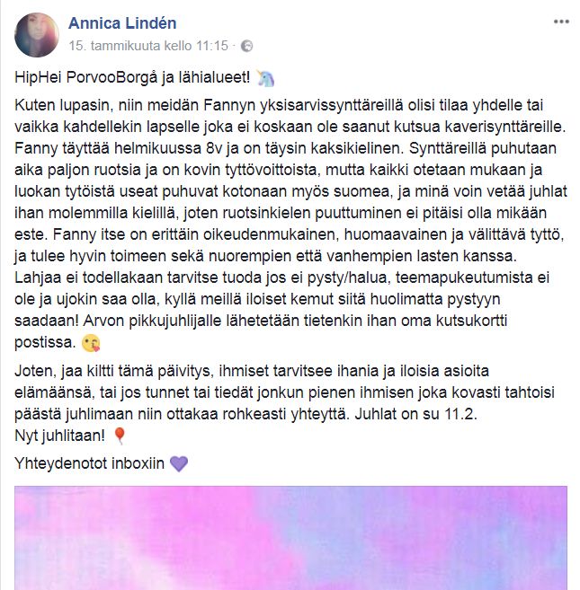 Jos siis Porvoon seudulla on joku, joka haluaisi kovasti yksisarvisjuhliin, ota yhteyttä Annicaan.