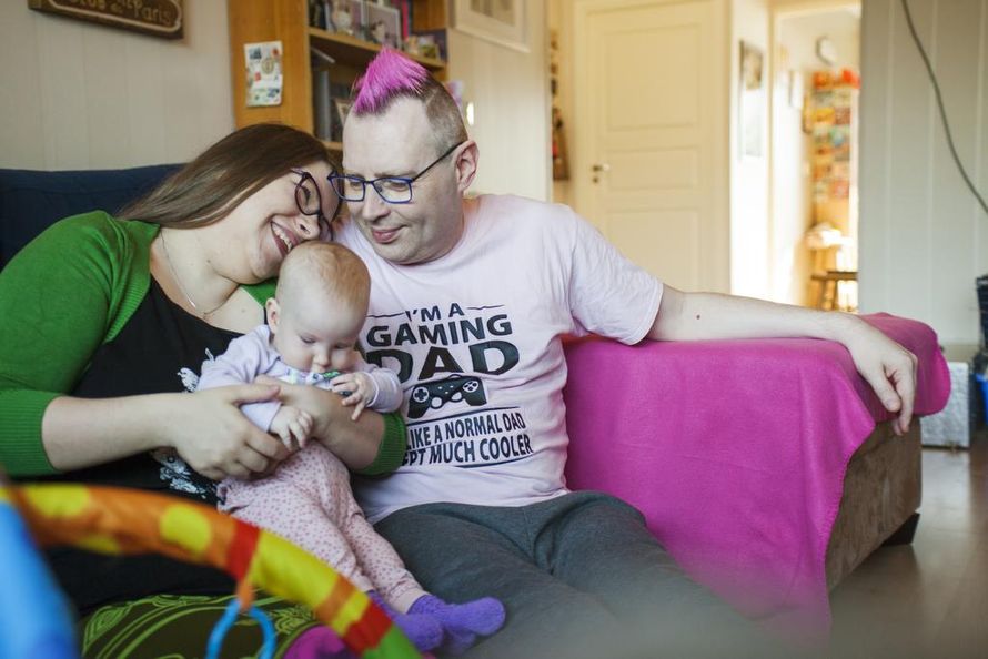 Koukkuun, ojennus, koukkuun, ojennus. Viisikuinen Aurora seuraa orvokinsinisillä silmillään tarkasti, kun isä Marko, 44, jumppaa hänen jalkojaan. Nilkan nostojen ja polven taivutusten välillä Marko ilmeilee Auroralle ja saa vastaukseksi hymyn.