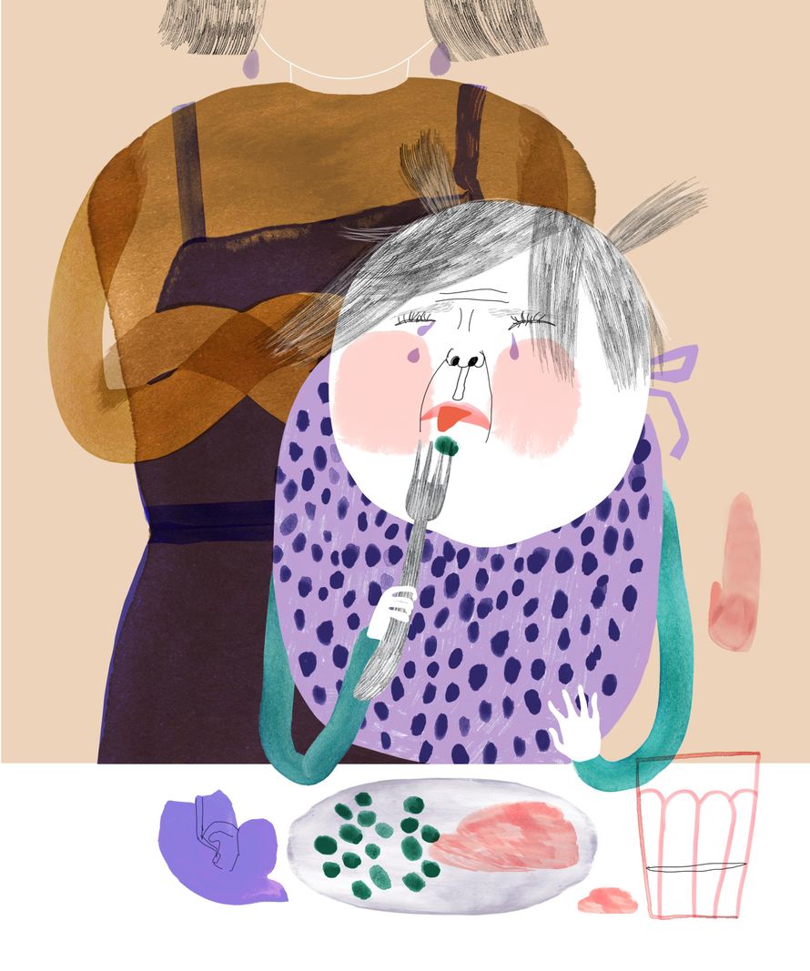En mieti ruuanlaittoon kulutettua aikaa, en ruokahävikkiä, enkä sitä loputonta ajatustyötä, jota olen tehnyt keksiäkseni aterian, josta lapsi saattaisi pitää. Katselen, miten lautanen pysyy koskemattomana ja kuuntelen hänen iloista puhettaan. Taistelu on turhaa, sillä olemme samalla puolella. Meillä on yhteinen päämäärä: viihtyä toistemme seurassa.