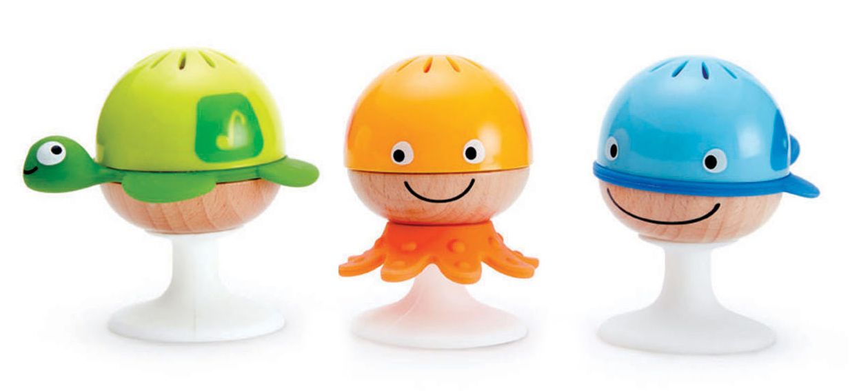 Merieläinaiheiset helistimet pysyvät paikoillaan imukuppien avulla. Kun ne kiinnittää esimerkiksi pöytään, lapsi voi tuottaa niillä ääntä, vaikka ei vielä osaisi tarttua helistimiin. Jokaisesta eläimestä kuuluu erilainen ääni. Materiaalina on käytetty sekä puuta että muovia. Kätevä viihdyke esimerkiksi pöydän ääressä istuessa.