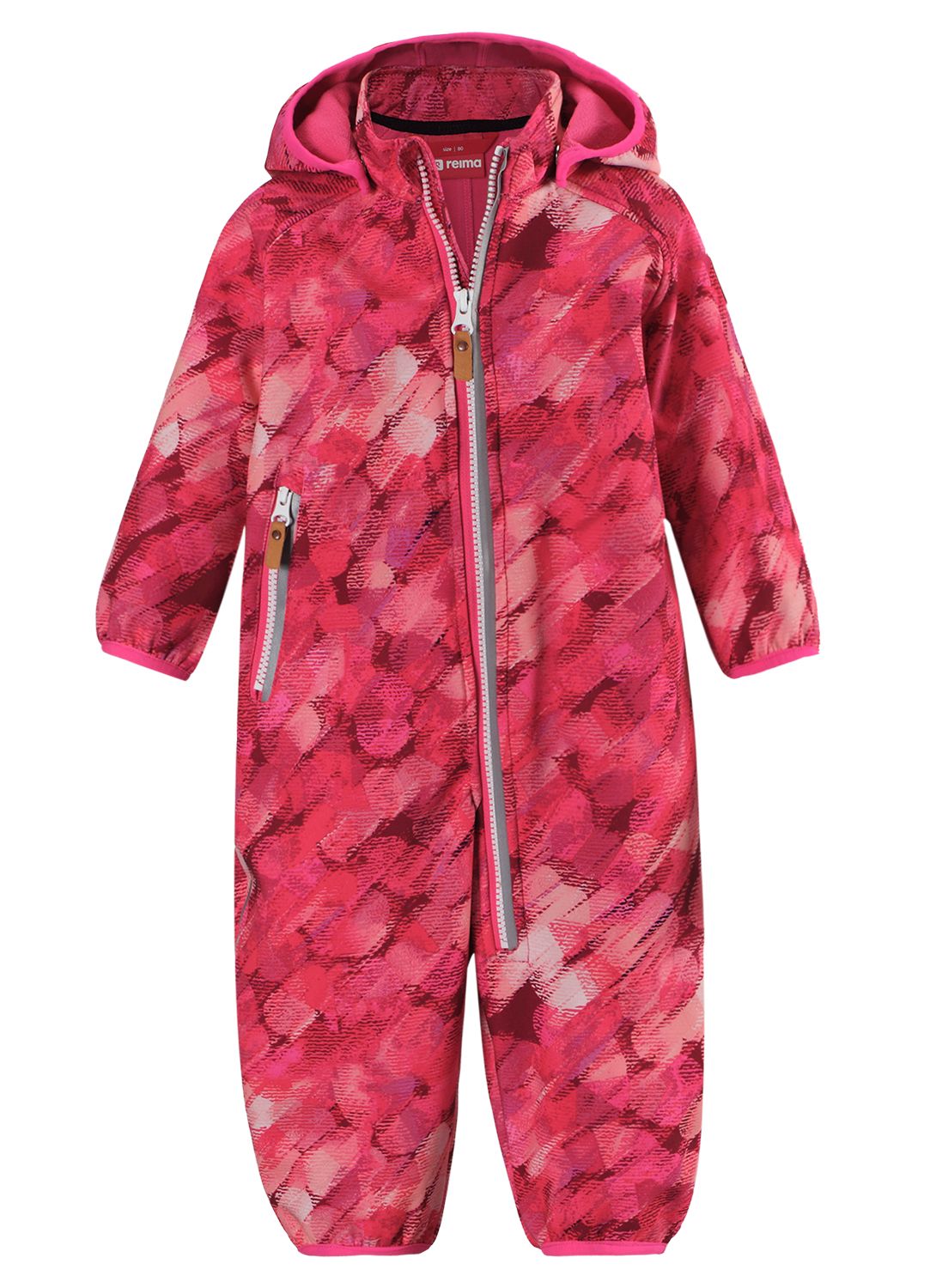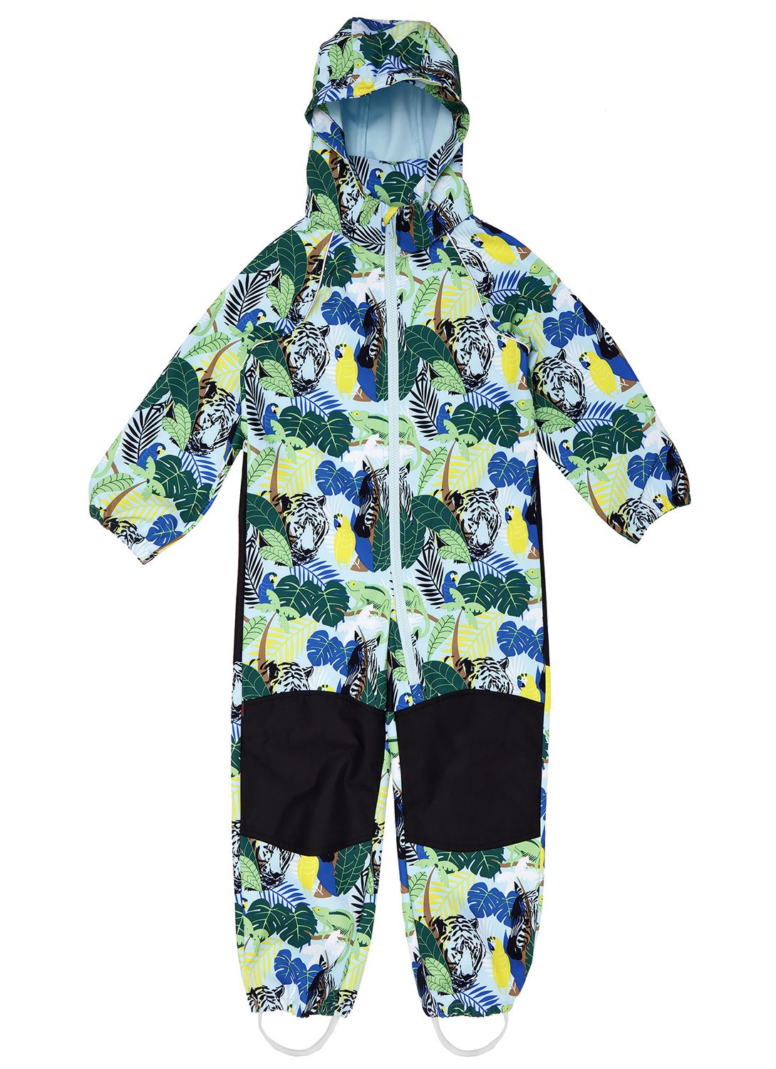 Korkeasaari-fiilikseen voi päästä myös kurkkaamalla vaatekaappiin. Pirteä viidakkohaalari kätkee sisäänsä sileän neulosvuoren. Softshell-haalarin polvissa ja takapuolessa on konttaamista ja muksahteluja kestävät vahvikkeet. Huppu on kiinnitetty kätevällä tarranauhalla, ja jalkalenkit ovat kulutusta kestävää silikonia. Saatavana myös pinkillä papukaijakuosilla.
