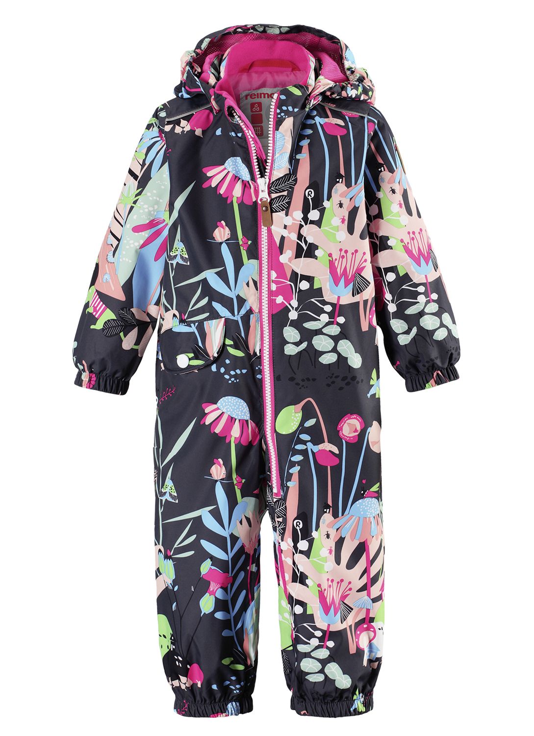 Kevään ensimmäiset kukat tulevat tässä. Haalari on käsitelty vettä ja likaa hylkiväksi, ja saumat on sinetöity vedenpitäviksi. Hupun ja jalkalenkit saa irti. Hihan- ja lahkeensuihin on tehty joustava kanttaus. Kukkakuosia on saatavana myös persikanvärisenä.