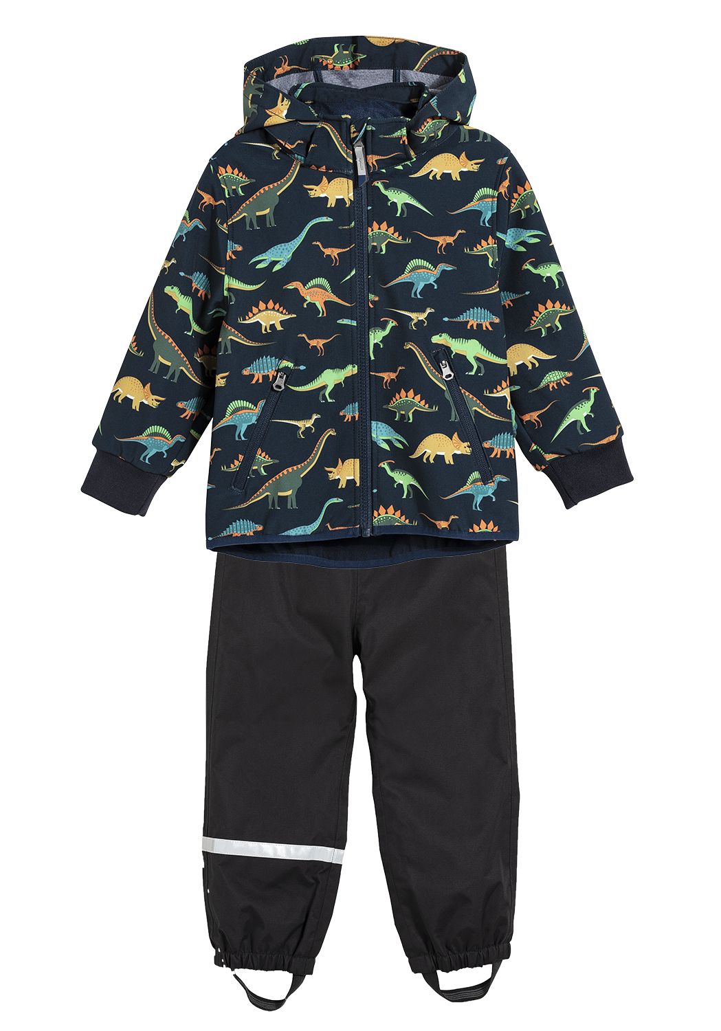 T-rex ja muut dinokaverit koristavat softshell-takkia, joka on valmistettu tuulenpitävästä materiaalista. Pystykaulus ja huppu antavat lisäsuojaa. Vuorelliset kuorihousut ovat tuulenpitävää ja hengittävää teknistä materiaalia. Housuissa on säädettävä joustovyötärö, suljetut saumat, heijastinnauha ja jalkalenkit. Musta väri on armollinen pihaleikeissä.