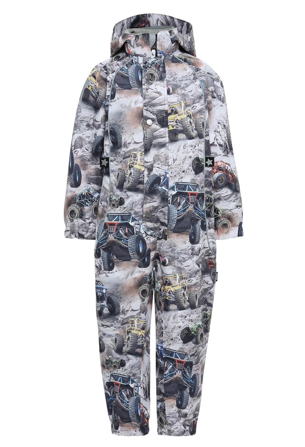 Haalarin hankauksenkesto on testitulosten mukaan huippuluokkaa, joten vaate kestää konttaamiset ja kaatuilut samoin kuin konepesun. Materiaali on hengittävää ja tuulenpitävää, ja housuosan haara- ja sivusaumat on teipattu. Hupun voi irrottaa ja jalkakuminauhat vaihtaa. Saatavana myös vihreänä, pinkkinä, mustana ja tummansinisenä.