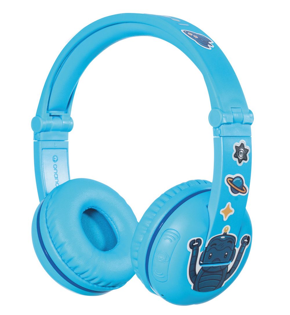 Kuulokkeet korvilla. Langattomien bluetoothkuulokkeiden akku kestää 12 tuntia. Neljä äänenvoimakkuustasoa ja neljä väriä. BuddyPhones Play BT, 54,95 e.