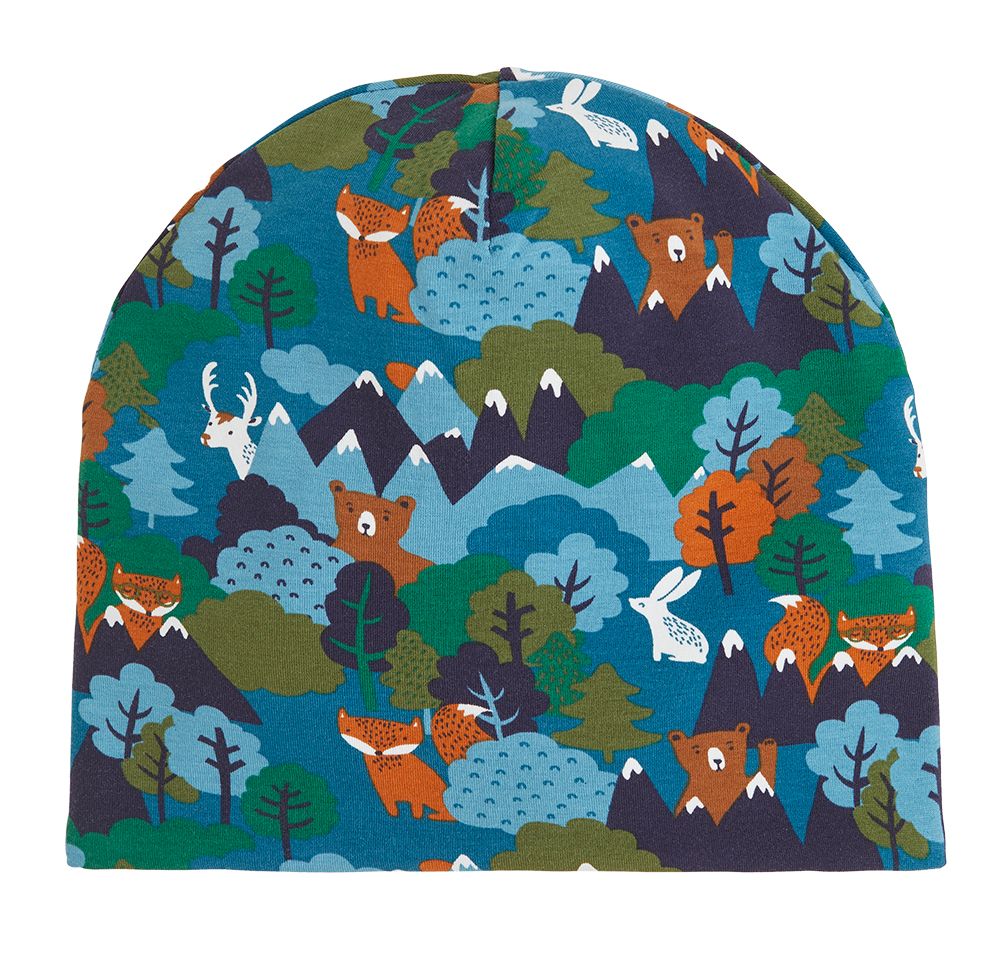 Pipon kuosissa kurkkivat kettu, karhu ja poro. Materiaali joustaa. Koot 48/50, 56/58. 8 e, Lindex.