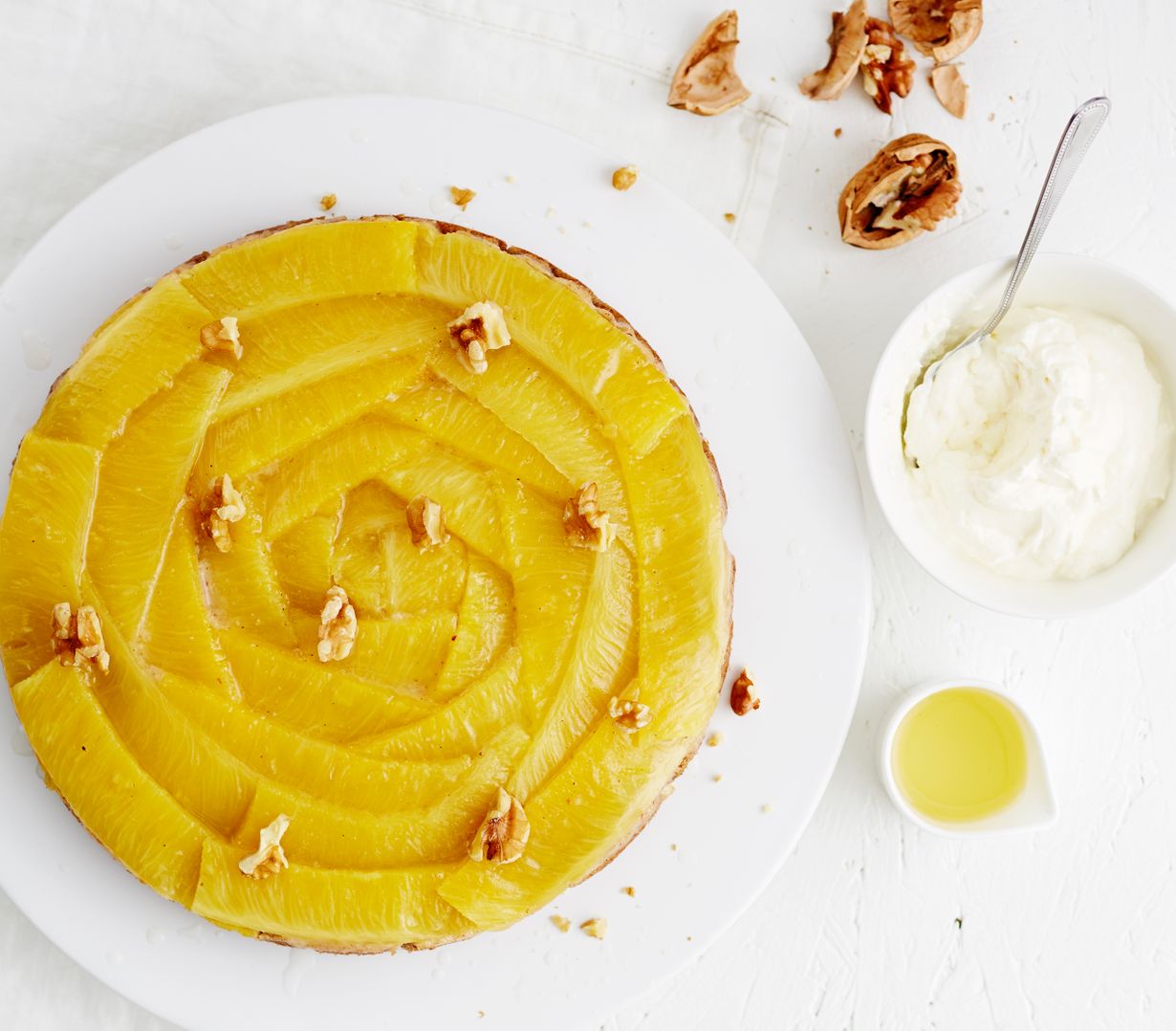 3. Leikkaa tasapohjaisen pyöreän kakkuvuoan (halkaisija 22–24 cm) pohjalle leivinpaperi. Voitele pohjan leivinpaperi ja voitele myös vuoan reunat öljyllä. Asettele vuokaan ananasviipaleet kauniisti kauttaaltaan. Valele päälle keittämääsi siirappimaista lientä 6–7 rkl. Säästä loppu sokeriseos.