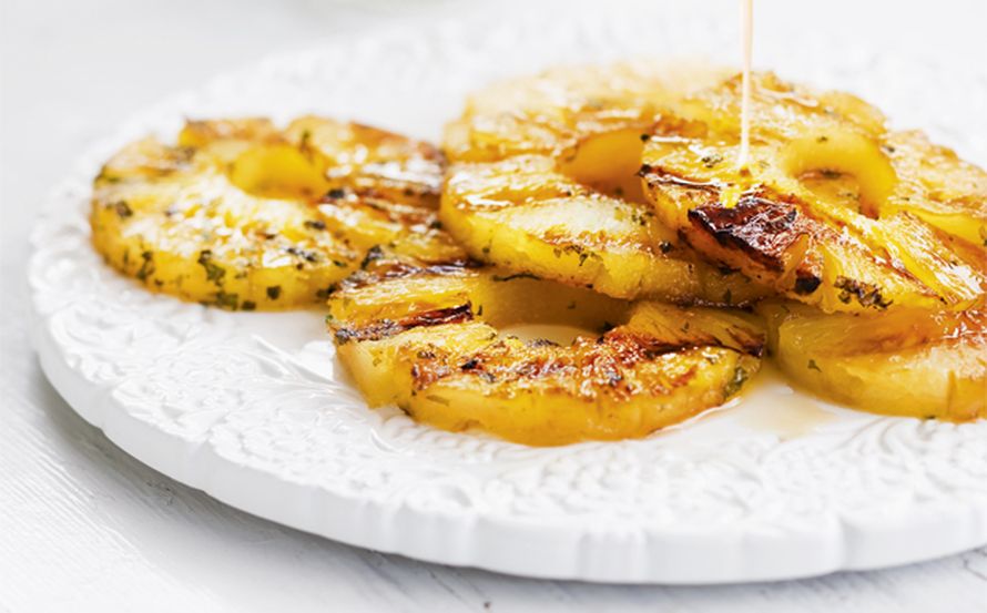 Kruunaa illallinen grillatuilla ananasrenkailla, jonka höysteenä maistuu siirappinen jogurttikastike.