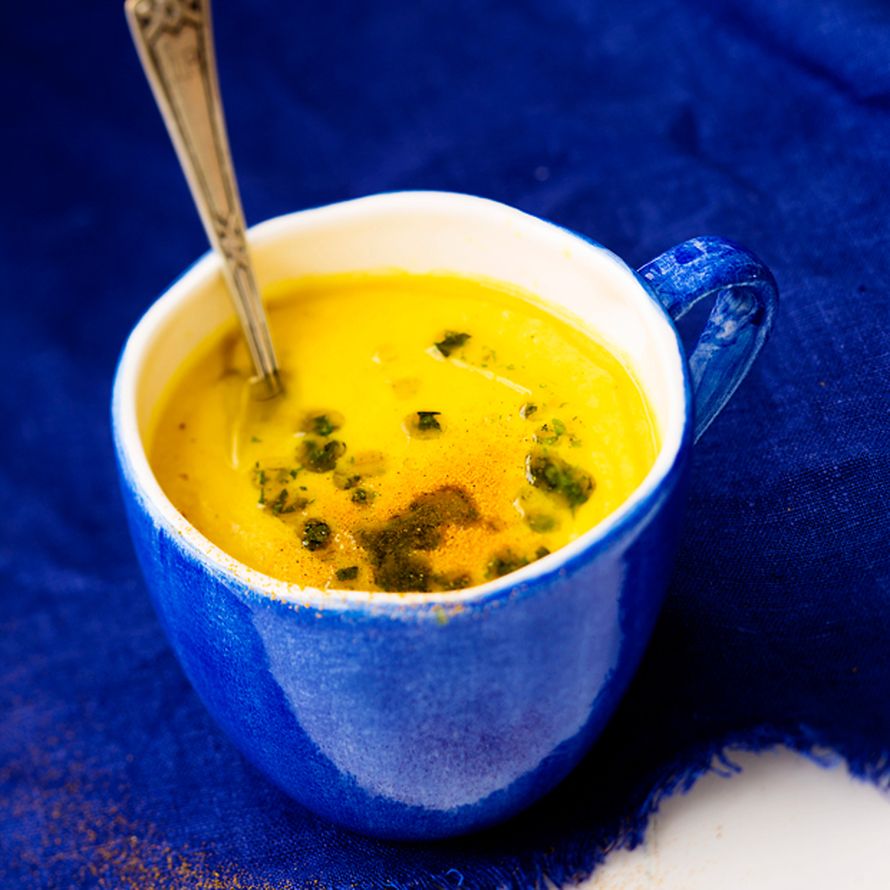 5. Lisää kerma, koristele yrttiöljyllä tai siemenillä ja tarjoa keitto kauraleivän (tarvittaessa gluteenittoman) kanssa. Yrttiöljy syntyy, kun silppuat basilikaa, lehtipersiljaa ja timjamia oliivi- tai rypsiöljyyn.