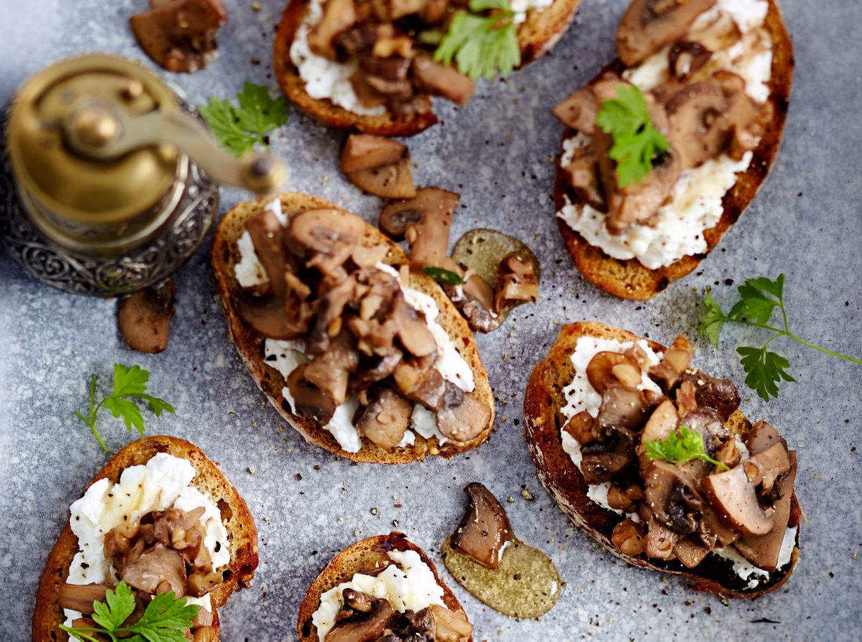 2. Paahda patonkiviipaleet rapeiksi toisella pannulla tai uunissa. Nosta päälle reilut kerrokset tuorejuustoa. Lisää mausteeksi tipoittain hunajaa ja rouhi päälle pippuria. Lisää leiville sieni-pähkinäseos ja tuoreita yrtinoksia.
