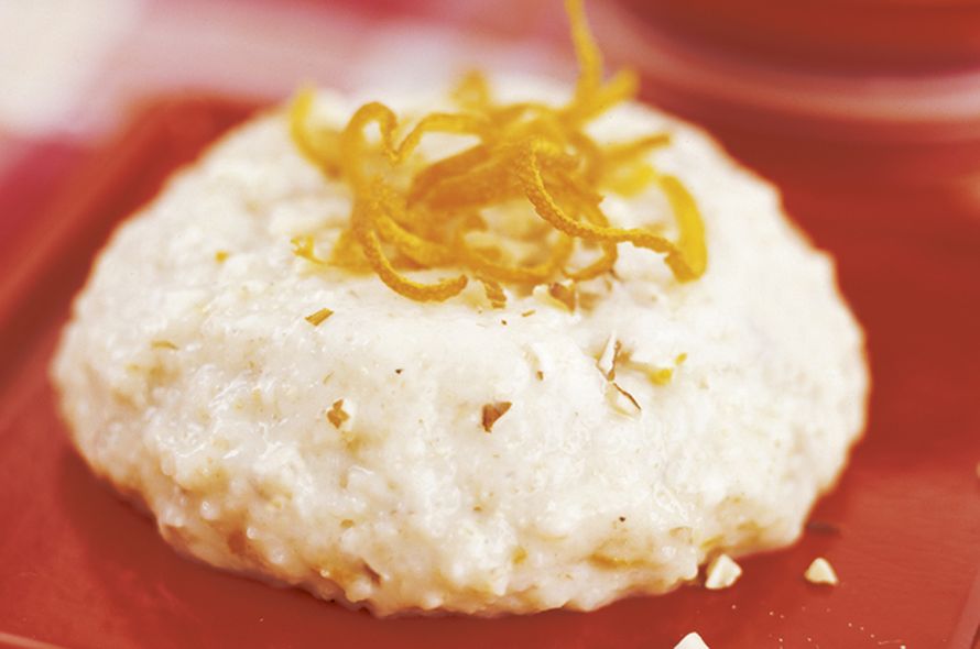 1. Sekoita mantelirouhe, appelsiininkuori ja -mehu sekä vaniljasokeri mannapuuron joukkoon.