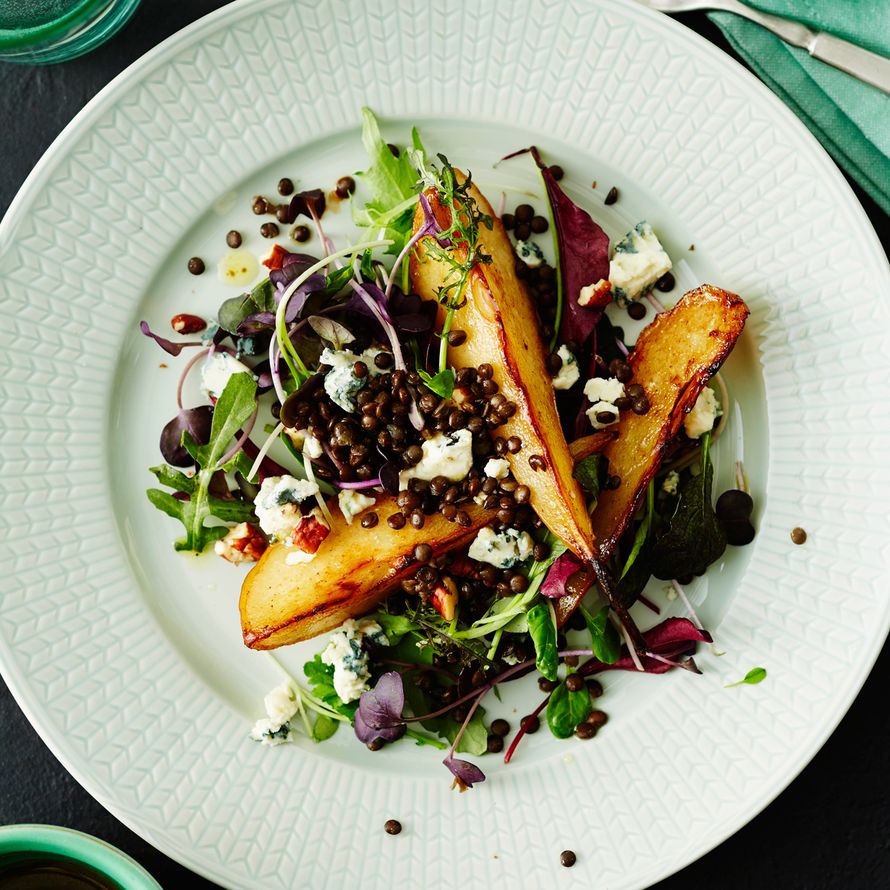 Levitä salaatinlehdet laakeaan tarjoiluastiaan tai lautasille. Lisää linssit kastikkeineen salaatinlehtien joukkoon kahdella lusikalla nostellen.