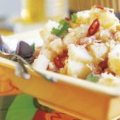 Sekoita kastikkeen aineet pieneen lasitölkkiin ravistaen. Valele kastike linsseihin ja sekoita.