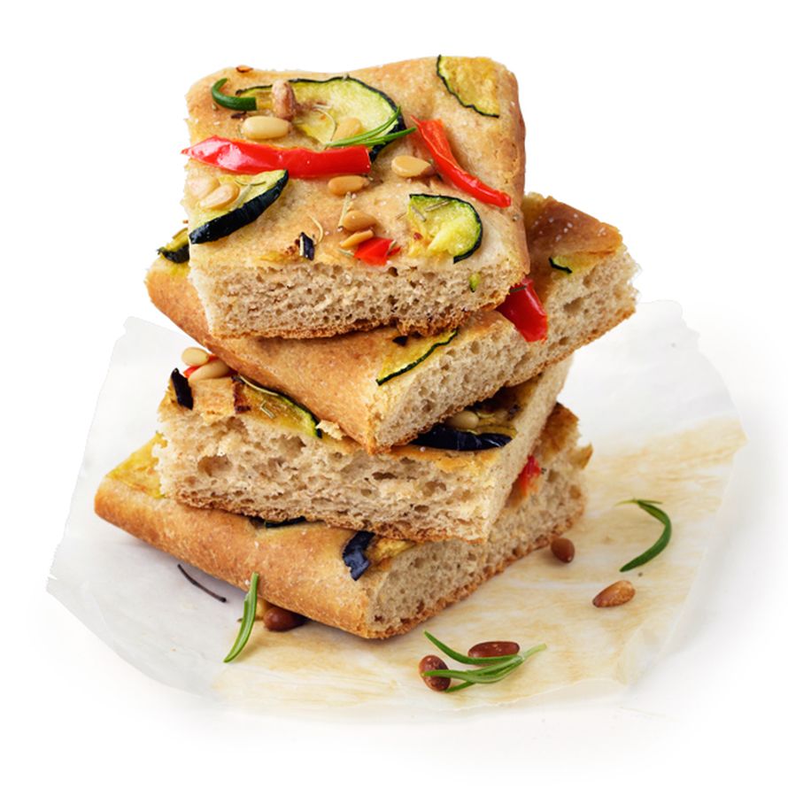 5. Asettele kasvikset taikinalle, voitele öljyllä, ripottele siemenet