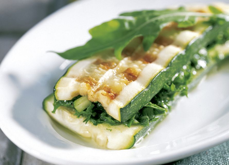 Kesäkurpitsapihvit täytetään rucolalla, yrteillä ja sipuleilla.
