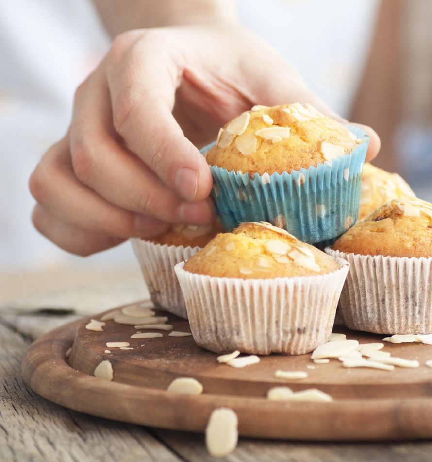Jaa taikina lusikalla 10 vuokaan. Ripottele ja painele mantelilastut pinnalle. Paista uunin toiseksi alimmalla tasolla 225 asteessa 10–12 minuuttia mehevän kypsiksi. Älä paista muffinsseja liian pitkään etteivät ne kuivu.
