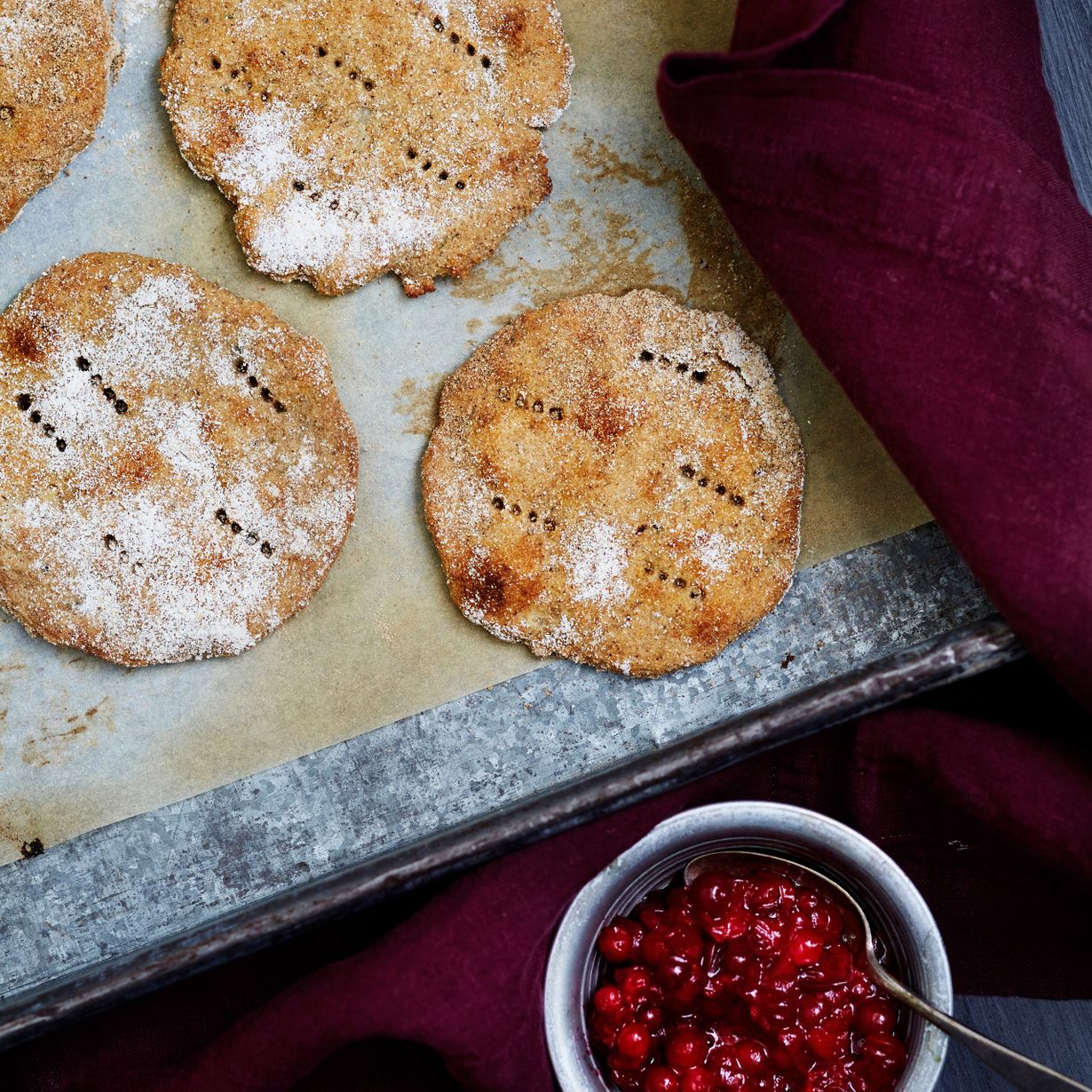 4. Pistele rieskat haarukalla ja paista 250-asteisessa uunissa vajaa 20 minuuttia. Tarjoa lämpiminä esim. raejuuston ja puolukkasurvoksen kanssa.