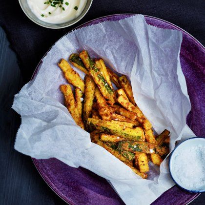 1. Leikkaa kesäkurpitsat ranskalaisten perunoiden kokoisiksi pitkulaisiksi tikuiksi (paksuus noin 1 cm). Kasta tikut maidossa ja pyörittele sen jälkeen jauho-oreganoseoksessa.