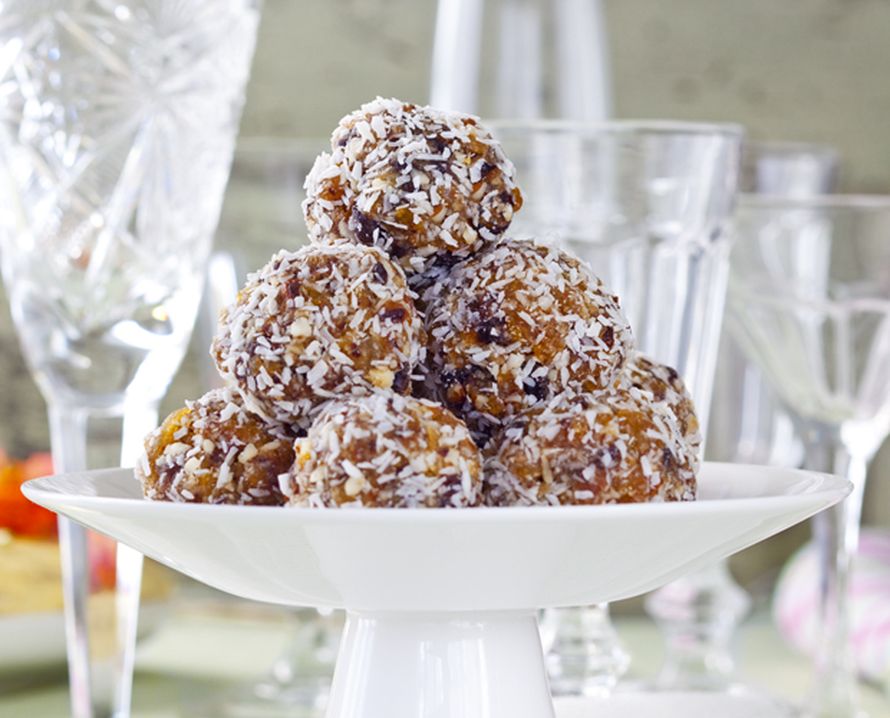 2. Sekoita tahini joukkoon. Pyöritä palloiksi ja kieritä kookoshiutaleissa.