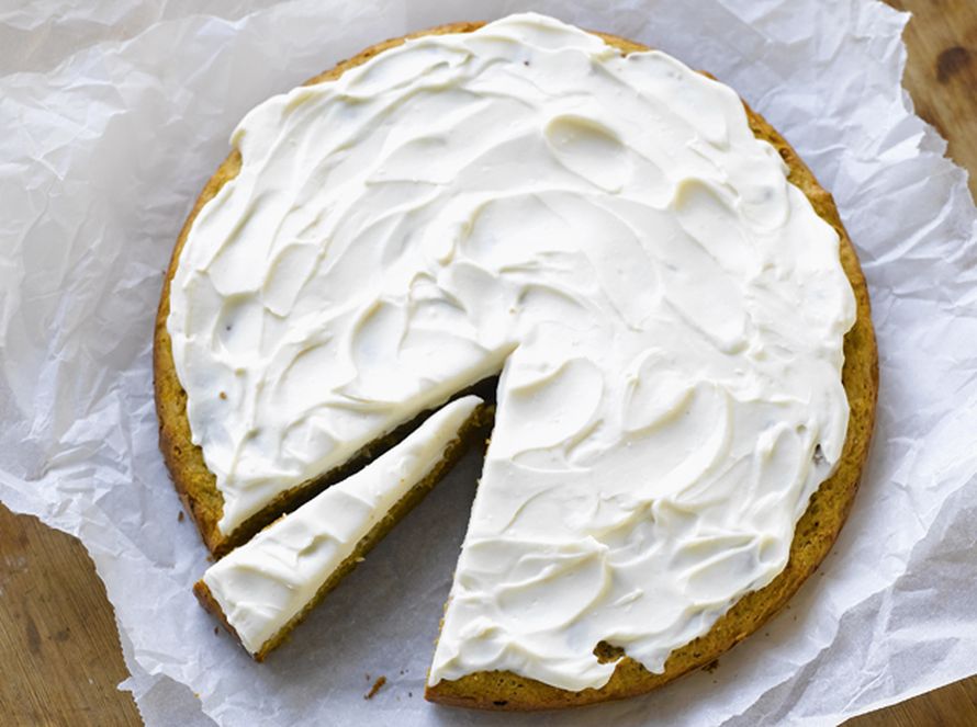 Kurpitsa-porkkanakakku kätkeytyy sitruunaisen rahkapilven alle.
